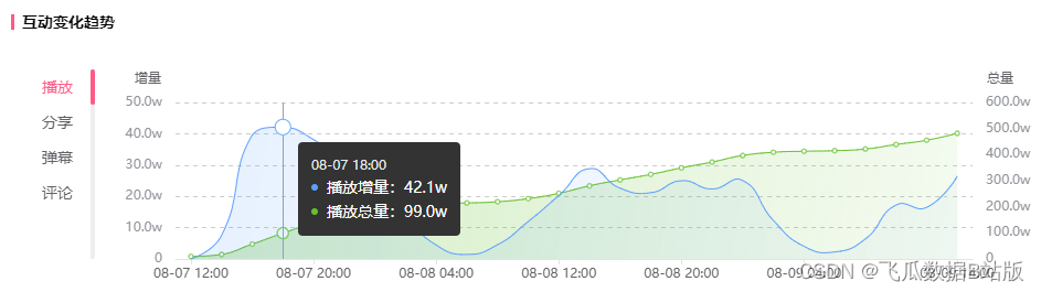 如此专业的创作水准简直是对其他UP主的降维打击,8月7日发布的作品,一天不到就上升至B站排行榜第一的位置,飞瓜数据(B站版)显示,从发布至今每小时数据监控中,最高一小时增长42.1w。