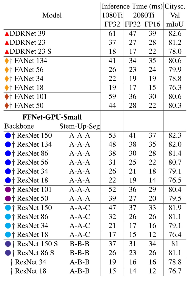 *表2. 模型的输出分割图分辨率为256×512,输入图像分辨率为1024×2048。在ResNet主干的第一个块中,FFNET的步长为1。