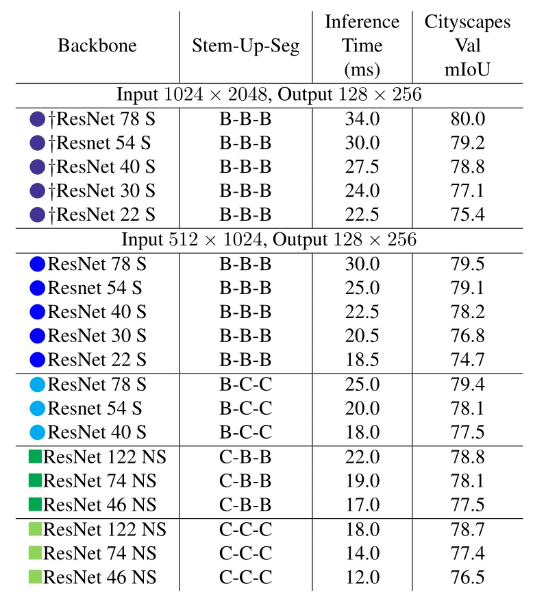 *表3. 模型的输出分割图分辨率为128×256,输入图像分辨率为1024×2048。此处报告的计时没有批次标准折叠,批次大小为1。†这些模型在ResNet主干的第一阶段使用步长=2。