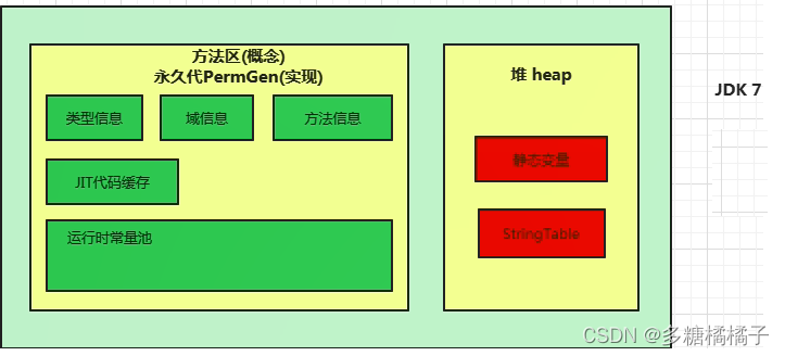 * 在JDK6.0及之前版本,字符串常量池是放在Perm Gen区(也就是方法区)中;