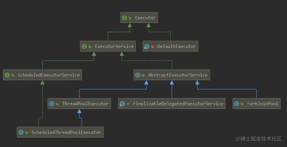 我们最常使用的Executors实现创建线程池使用线程主要是用上述类图中提供的类。在上边的类图中,包含了一个Executor框架,它是一个根据一组执行策略的调用调度执行和控制异步任务的框架,目的是提供一种将任务提交与任务如何运行分离开的机制。它包含了三个executor接口: