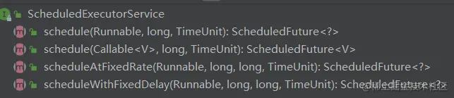 当一个任务提交时,corePoolSize为自定义输入,首先创建核心线程,核心线程满了之后,因此最终会创建非核心线程来执行任务。非核心线程使用后将被回收。因为Integer.MAX_VALUE非常大,可以认为是可以无限创建线程的,在资源有限的情况下容易引起OOM异常。因为使用的DelayedWorkQueue可以实现定时和周期任务。 ScheduledExecutorService提供了三种方法可以使用: