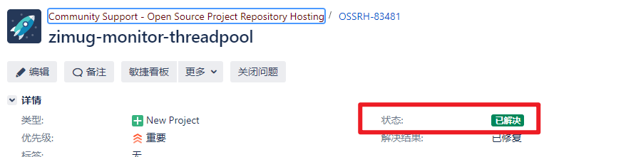 一切都ok之后,最好回到sonatype JIRA管理平台将“问题”关闭,这样sonatype JIRA管理流程就全部完成了。