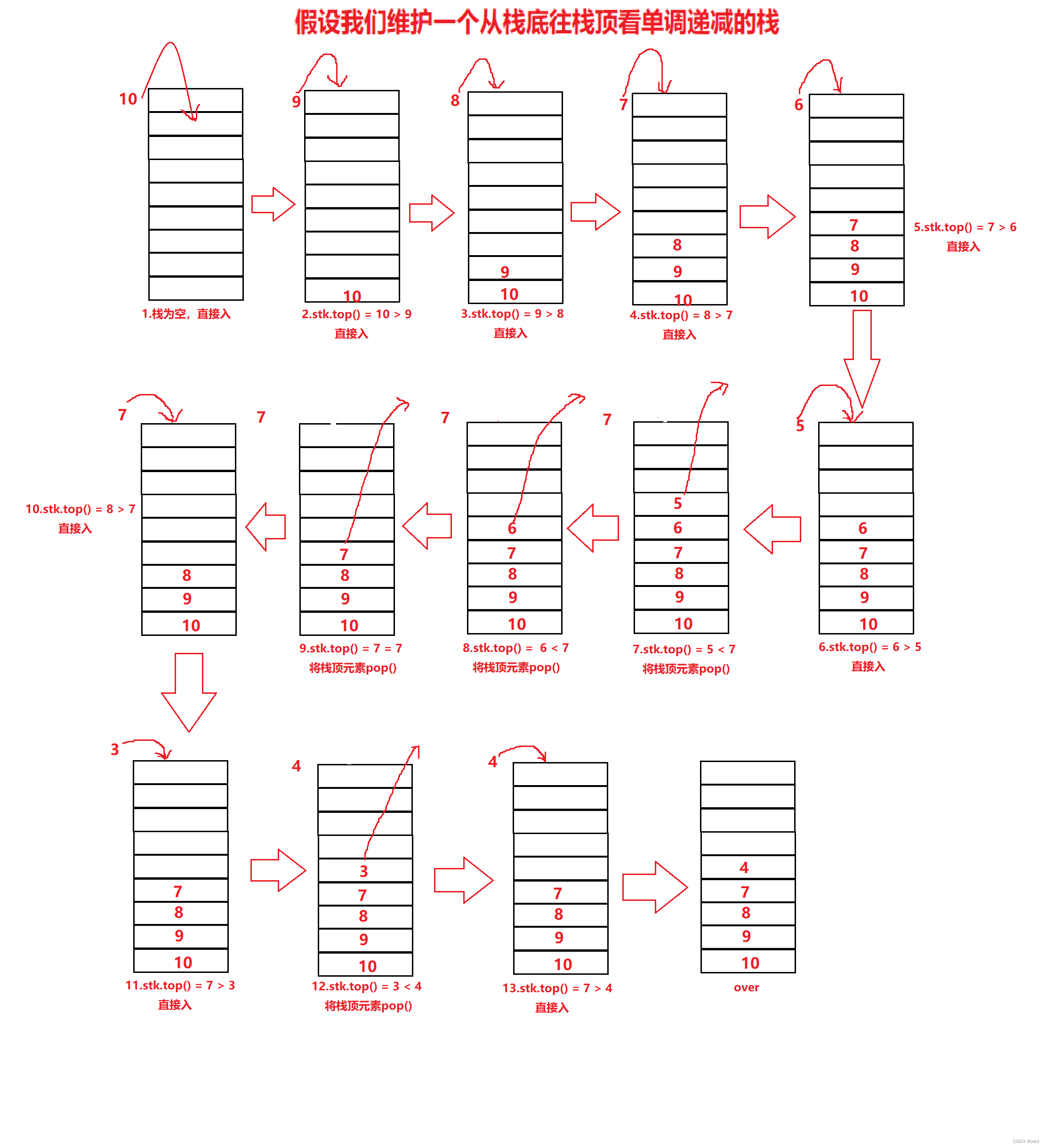 在这样一个过程当中,我们维护的是一个从栈底到栈顶元素单调递减的栈。