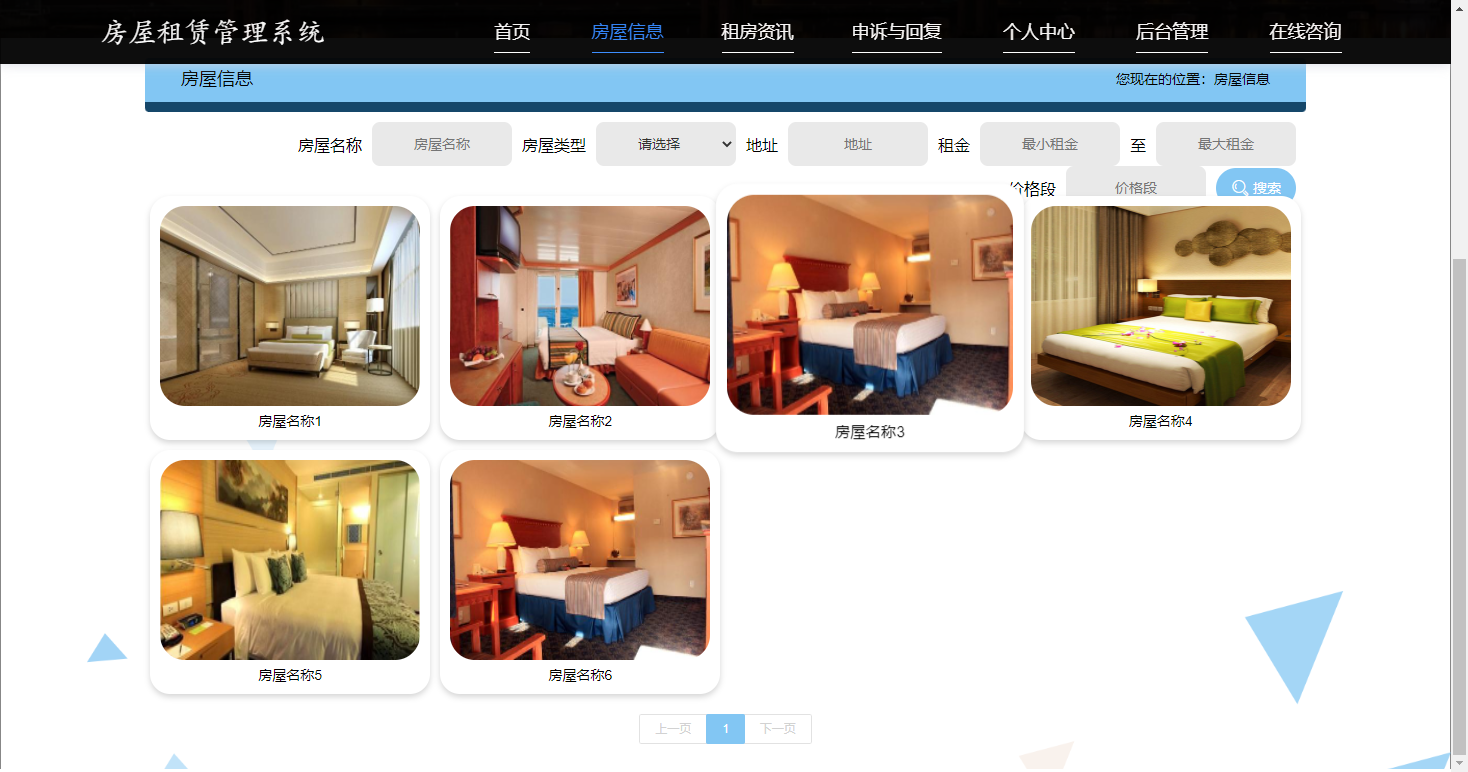 前台用户:首页可以查看房屋信息、租房资讯、申诉与回复、个人中心、后台管理、在线咨询等