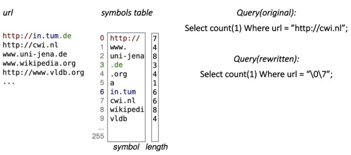 字典压缩算法通常具有保序性: 如下图所示字典映射后原字符串和编码相对顺序不变,方便直接在压缩数据上进行range查询优化。