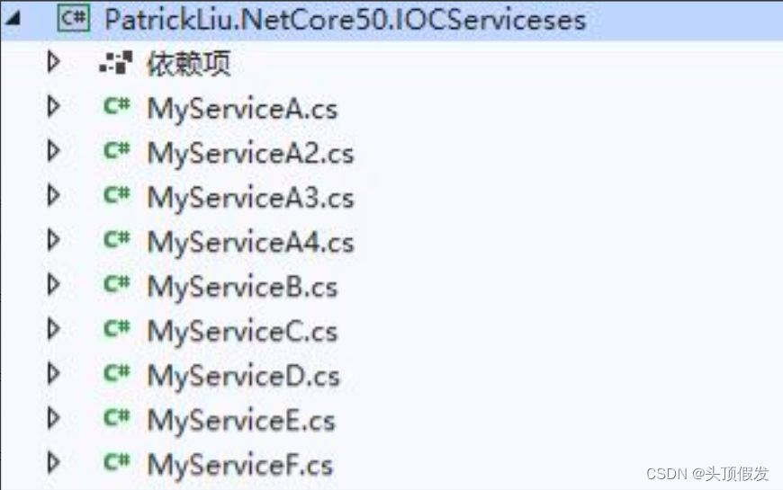 1 /// 2 /// 3 /// </summary> 4 public class MyServiceB : IServiceB 5 { 6 /// 7 /// 8 /// </summary> 9 /// "serviceC"></param>10 /// "serviceE"></param>11 public MyServiceB(IServiceC serviceC,IServiceE serviceE)12 {13 Console.WriteLine("MyServiceB is created");14 }15 16 /// 17 /// 18 /// </summary>19 public void Show()20 {21 Console.WriteLine("MyServiceB-Show()");22 }23 }