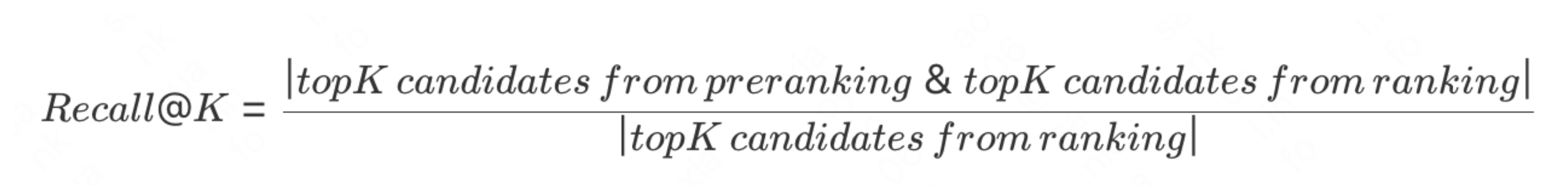 传统的排序离线指标多以 NDCG、MAP、AUC 类指标为标准,对于粗排来说,其本质更偏向于以集合选择为目标的召回类任务,因此传统的排序指标不利于衡量粗排模型迭代效果好坏。我们借鉴[6]中 Recall 指标作为粗排离线效果的衡量指标,即以精排排序结果为 ground truth,衡量粗排和精排排序结果 TopK 的对齐程度。Recall 指标具体定义如下: