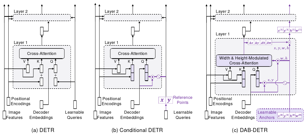 图1:DETR、Conditional DETR和我们提出的DAB - DETR的比较。为了清晰起见,我们只展示Transformer解码器中的交叉注意力部分。