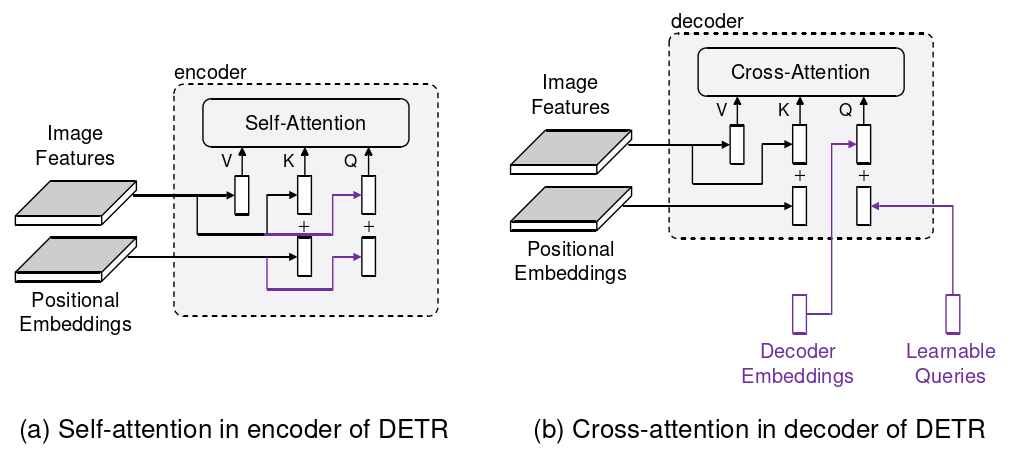 图2:DETR的编码器中的自注意力和解码器中的交叉注意力的比较。由于它们具有相同的键和值组件,唯一的区别来自于查询。编码器中的每个查询由图像特征(内容信息)和位置嵌入(位置信息)组成,而解码器中的每个查询由解码器嵌入(内容信息)和可学习的查询(位置信息)组成。两个模块之间的差异用紫色标出。