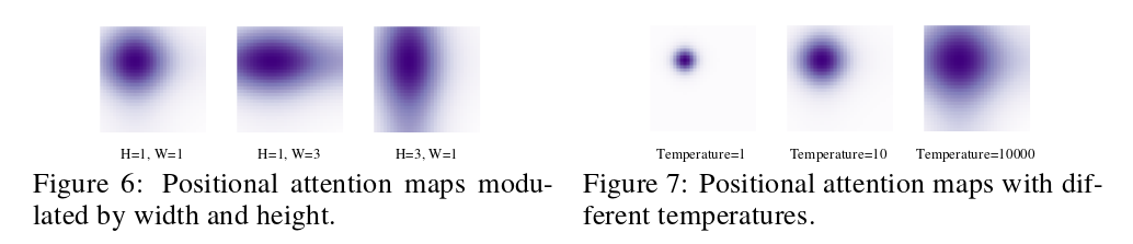 其中 T 是手工设计的温度,上标 2i 和 2i+1 表示编码向量中的索引。式( 8 )中的温度 T 影响位置先验的大小,如图7 所示。较大的 T 导致更平坦的注意力图,反之亦然。需要注意的是,在自然语言处理中,温度 T 被硬编码为 10000,其中 x 是整数,表示每个单词在句子中的位置。然而,在DETR中,x 的值在 0 和 1 之间浮动,代表 bbox 坐标。因此,对于视觉任务来说,不同的温度是非常需要的。在这项工作中,我们在所有的模型中实证选择 T = 20。