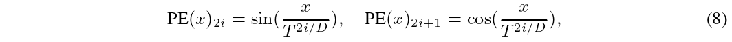 概念 Cat 表示串联函数。在我们的实现中,位置编码函数 PE 将浮点映射到一个具有 D / 2 维的向量:PE: