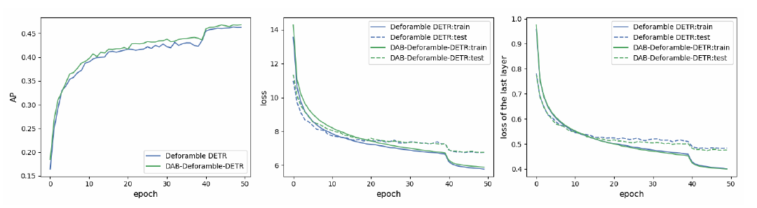 图9:Deformable DETR和DAB - Deformable - DETR模型的训练对比。我们分别绘制了训练过程中AP的变化(左)、所有层的损失(中)和最后一层的损失(右)。与原始的可变形DETR模型(见左图)相比,DAB - Deformable - DETR在代码修改不超过10行的情况下获得了更好的性能。虽然DAB - Deformable - DETR的所有层的损失都比DeformableDETR (看到中间的身影)大,但是我们的模型在最后一层(见右图)的损失更低,这是最重要的,因为推理结果只取自最后一层。这两个模型在相同的标准R50多尺度设置下进行测试。