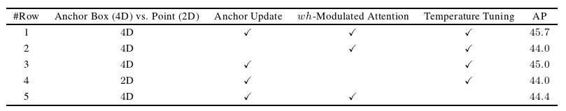 表3:我们的DAB - DETR消融结果。所有模型都在ResNet - 50 - DC5主干上进行测试,其他参数与我们的默认设置相同。