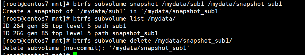 - btrfs subvolume delete /mydata/snapshot