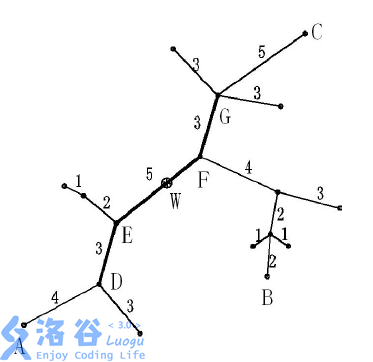 T=(V,E,W) 是一个无圈且连通的无向图(也称为无根树),每条边都有正整数的权,我们称