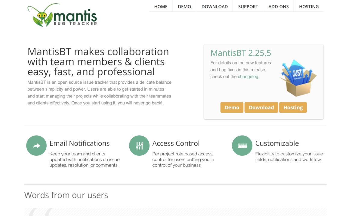 Mantis是一个基于PHP技术的轻量级的缺陷跟踪系统,其功能与前面提及的JIRA系统类似,都是以Web操作的形式提供项目管理及缺陷跟踪服务。在功能上可能没有JIRA那么专业,界面也没有JIRA漂亮,但在实用性上足以满足中小型项目的管理及跟踪。更重要的是其开源,不需要负担任何费用。不过目前的版本还存在一些问题,期待在今后的版本中能够得以完善。(官网: https://www.mantisbt.org/ )