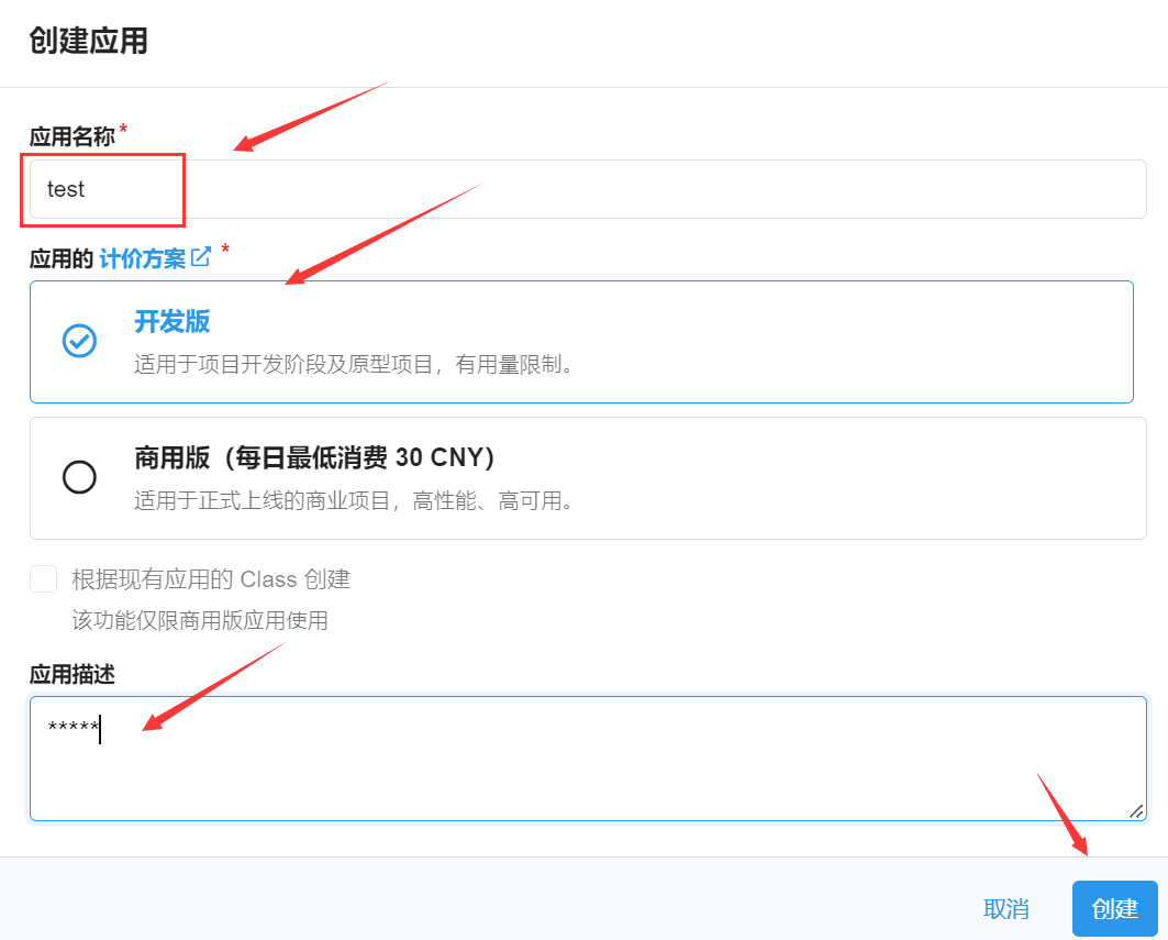点击 存储 -> 结构化数据,选择创建 Class,名称 Counter,其他保持默认,以后就可在此 Class 内查看
