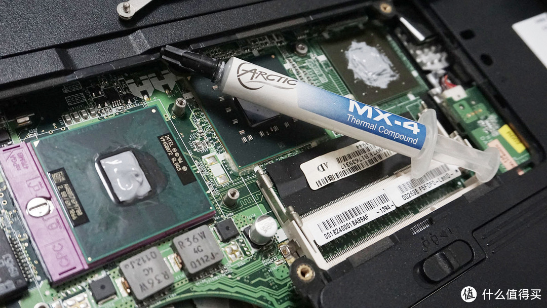 直接拆下散热管固定的螺钉及角落的风扇,清洁内部的灰尘,CPU上面的硅脂还是有些黏黏的,不记得是上次什么时候重新换过一次硅脂,上次装机剩下的AC MX-4 硅脂有剩一点。转开下方的螺丝,取下CPU换上P9700,注意左下角的三角标识。