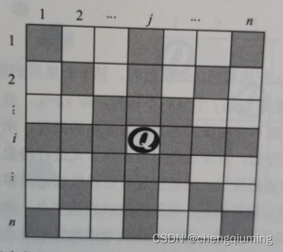 如果棋盘如下图所示,我们在第 i 行第 j 列放置一个皇后,那么第 i 行其他位置,第 j 列其他位置,同一斜线上的其他位置,都不能再放皇后。
