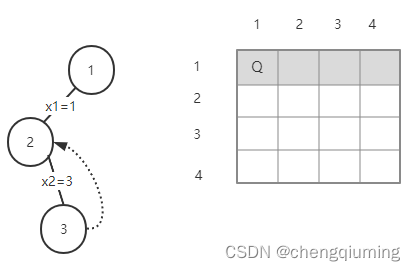 3 在第 3 行放置第 3 个皇后。第 3 个皇后的位置不能与前 2 个皇后同列、同斜线。