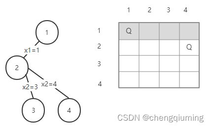 不满足约束,称为死节点,向上回溯到节点 1.