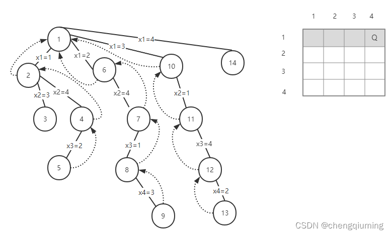t > n,找到一个可行解,用 bestx[] 保存当前可行解{3,1,4,2}。节点 13 称为死节点,向上回溯到节点 12。