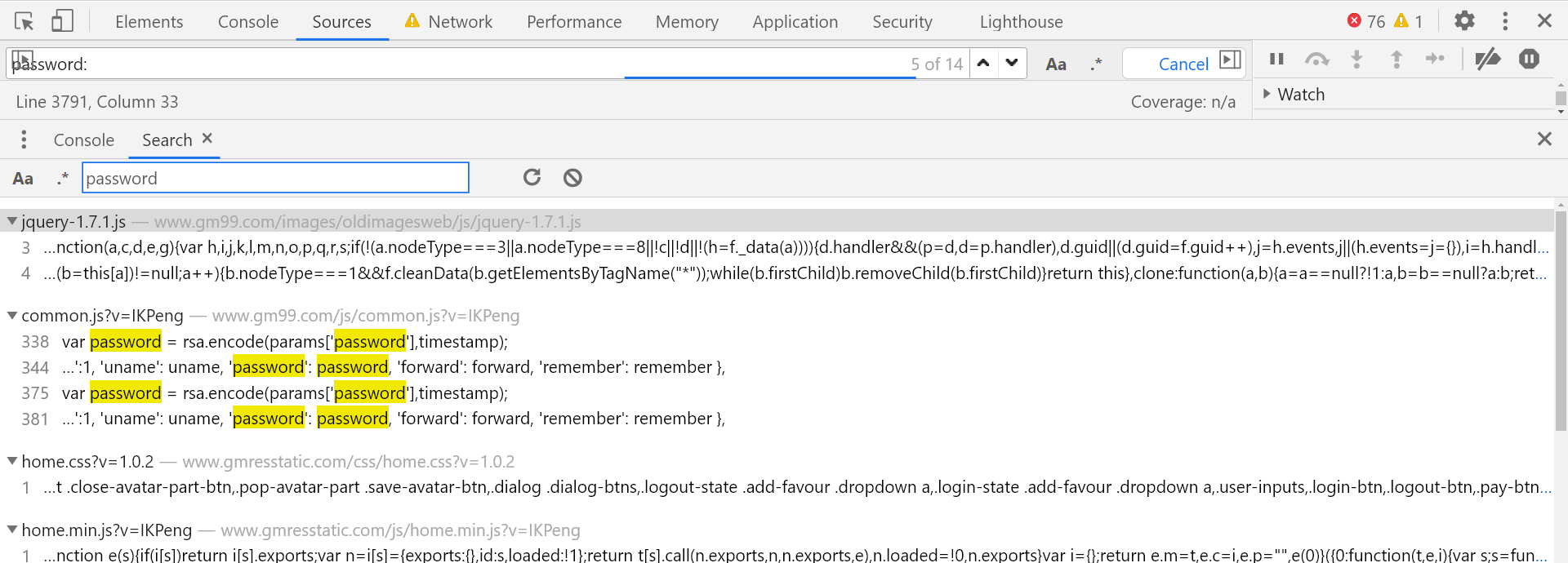通过分析可知加密位置在 home.min.js 文件中,点击进入该 JS 文件,会发现被压缩了,为了便于查看点击左下角的 { } 进行格式化操作,接着 CTRL + F 局部搜索 password,会发现有 83 个结果,这么多不便于查找分析,由于 password 是 JSON 格式的数据,所以可以直接搜索 password: ,搜索结果减少到了 14 个,大大降低了查找的工作量: