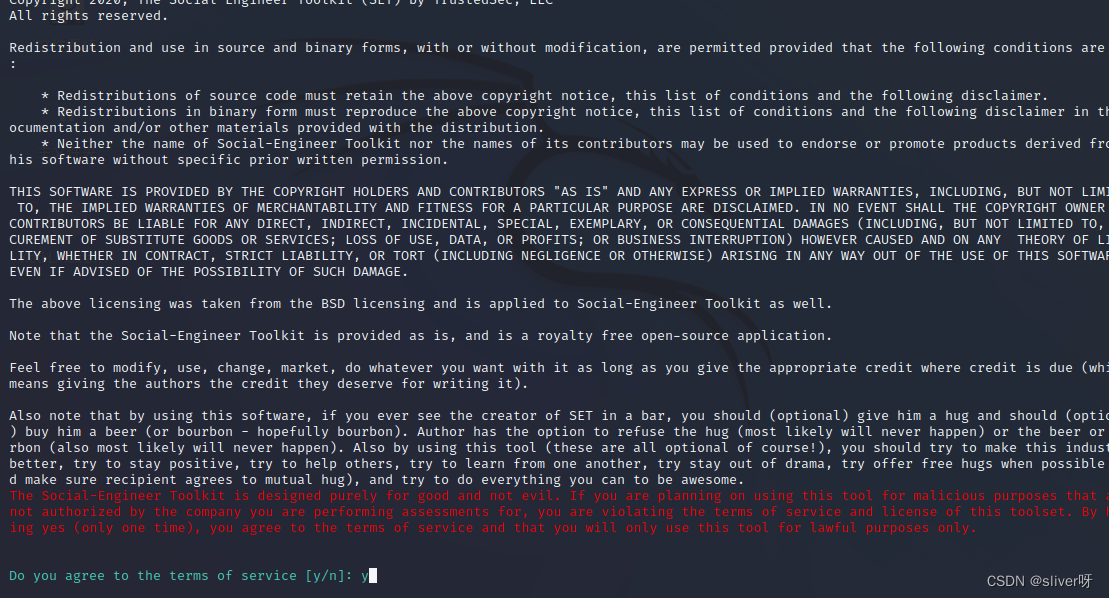 1、登录到kali,在kali的工具包里找到social-engineer-toolkit,并打开,第一次打开会显示如下界面,且“同意服务条款”: