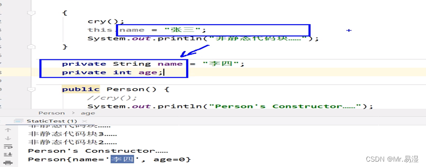 ⑤非静态代码块可有多个,依次向下顺序执行为属性赋初始值的方式:①默认值(缺省值)② 直接显示赋值 ③ 构造器 ④ 代码块