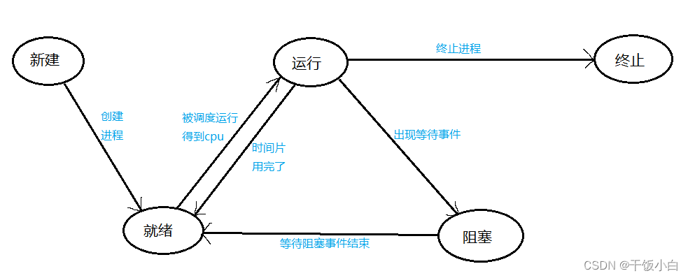 如果A阻塞,B必须等待。A发生等待事件才会进入阻塞状态哦,所以此时A并没有占用CPU,那么就会导致CPU处于空闲状态。导致CPU资源的浪费(人们总是希望CPU能够永远不休息的工作)