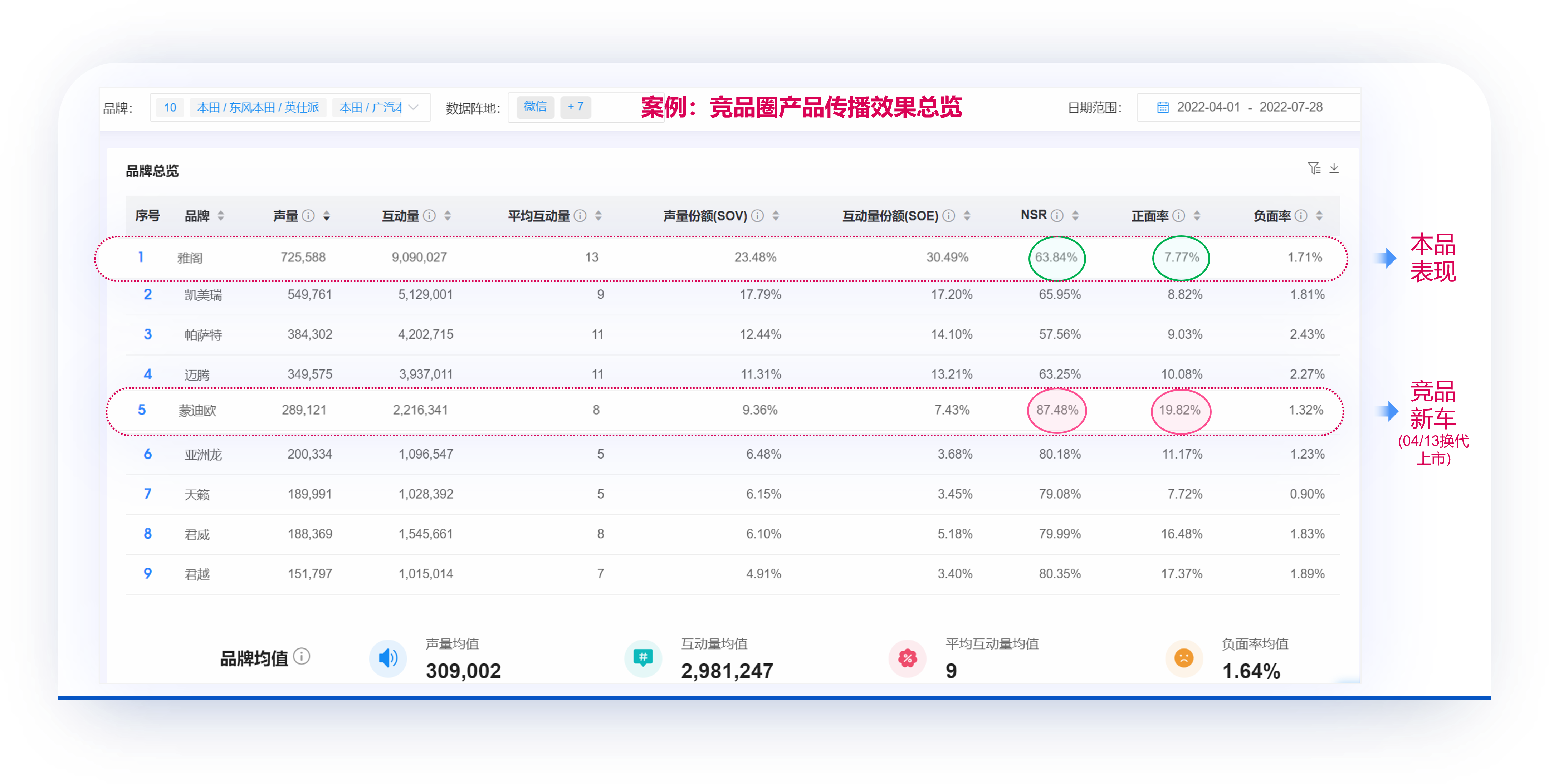 通过跟踪核心竞品圈车型的传播效果得知,蒙迪欧换代上市以来,共收获28万+声量、200万+互动量,位居中上游;而NSR (净正面情感值)处于榜首,反映出蒙迪欧换代上市引发了市场关注热潮及正面反馈,将对头部竞品构成一定威胁。