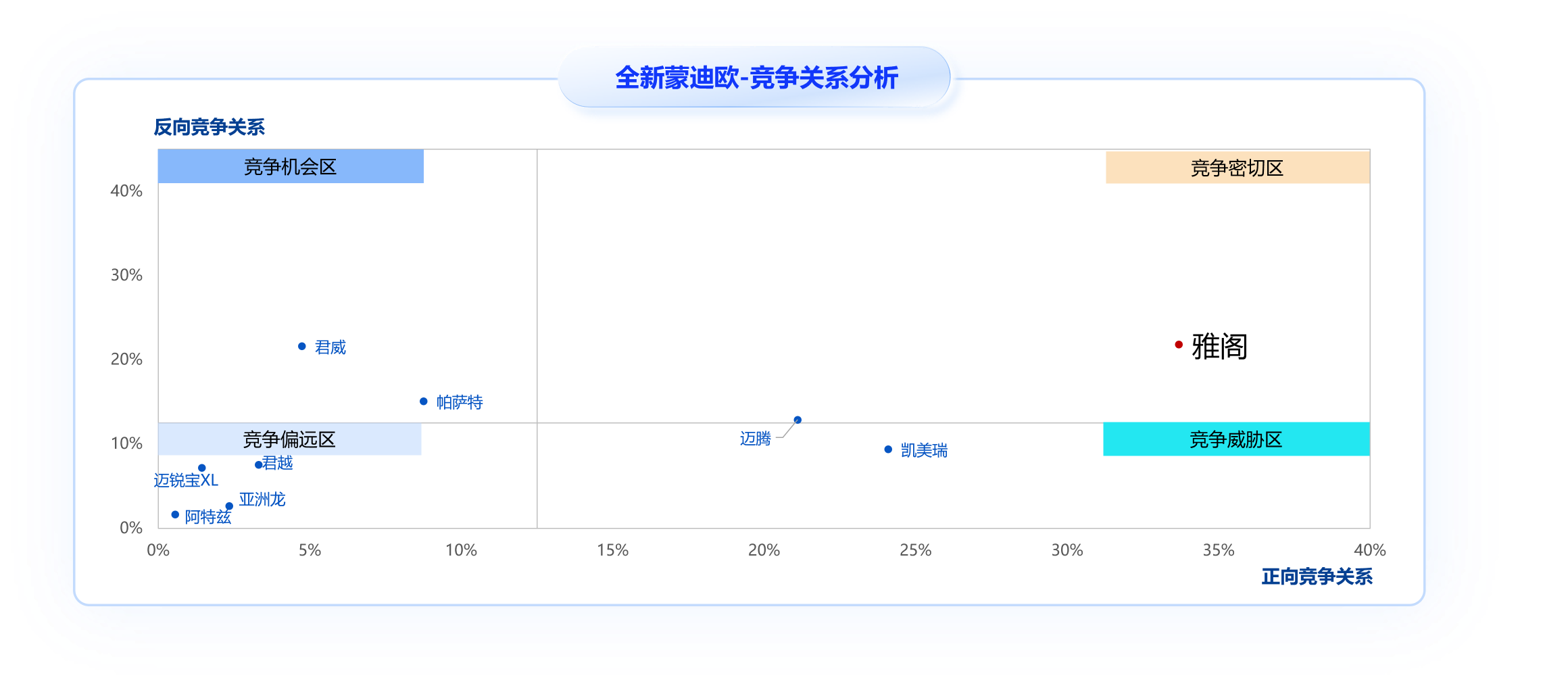 基于汽车垂媒的口碑数据,通过分析正向、反向竞争关系圈定核心竞品。蒙迪欧换代后核心竞品为雅阁,重要竞品为凯美瑞、迈腾、君威等。