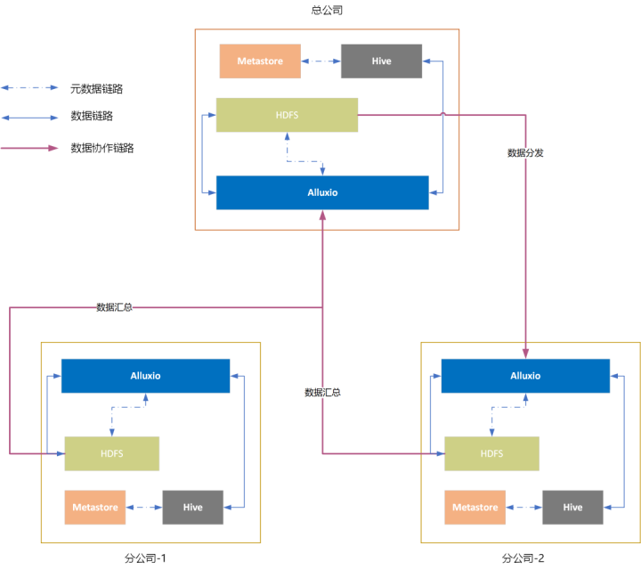 使用HDFS、Hive、Alluxio定义数据持久化与数据访问链路。在总公司和分公司构建统一的技术栈(技术标准),实现数据共享闭环: 1 在总公司数据域,实现分公司数据联邦,允许总公司实现全域数据访问与分析;