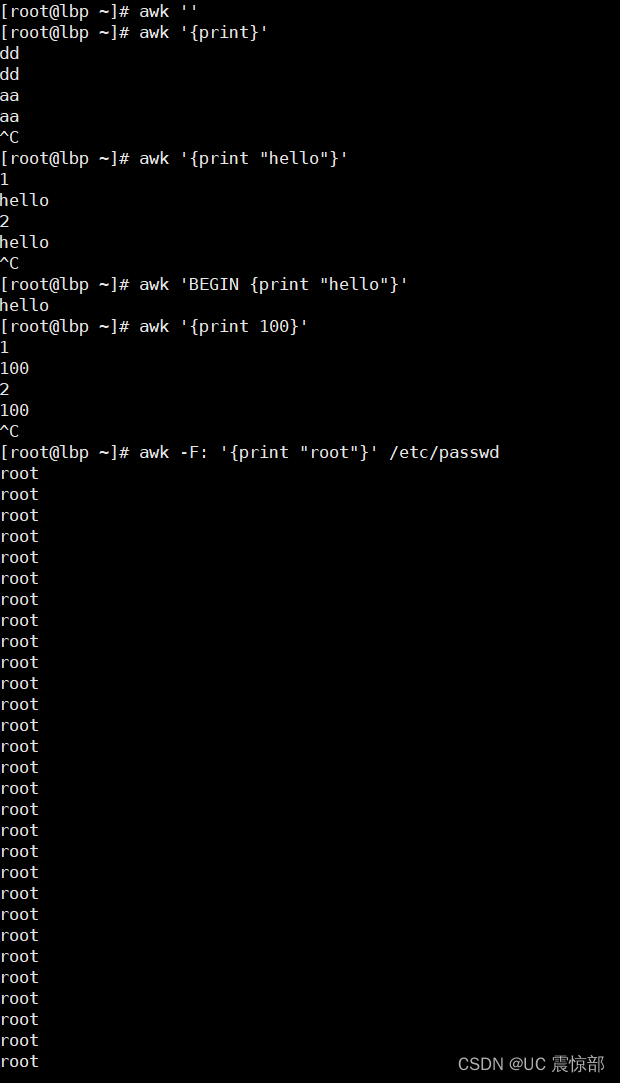 - [root@localhost ~]#awk -F: '{print "root"}' /etc/passwd