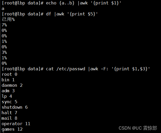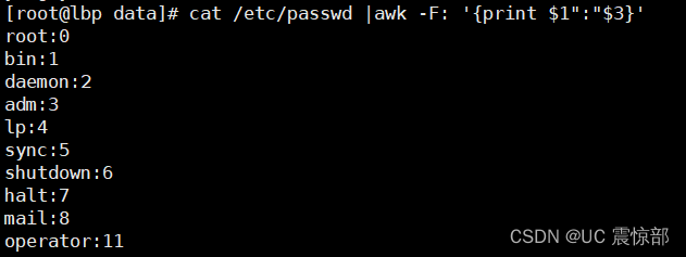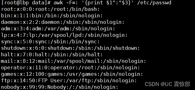 - [root@localhost ky15]#awk -F: '{print $1":"$3}' /etc/passwd
