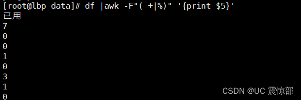 - [root@localhost ky15]#df |awk -F"[ %]+" '{print $5}'