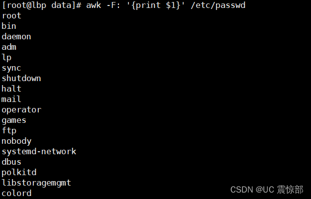 - [root@localhost ~]#awk -F: '{print $1}' /etc/passwd