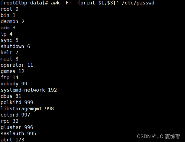- [root@localhost ~]#awk -F: '{print $1,$3}' /etc/passwd
