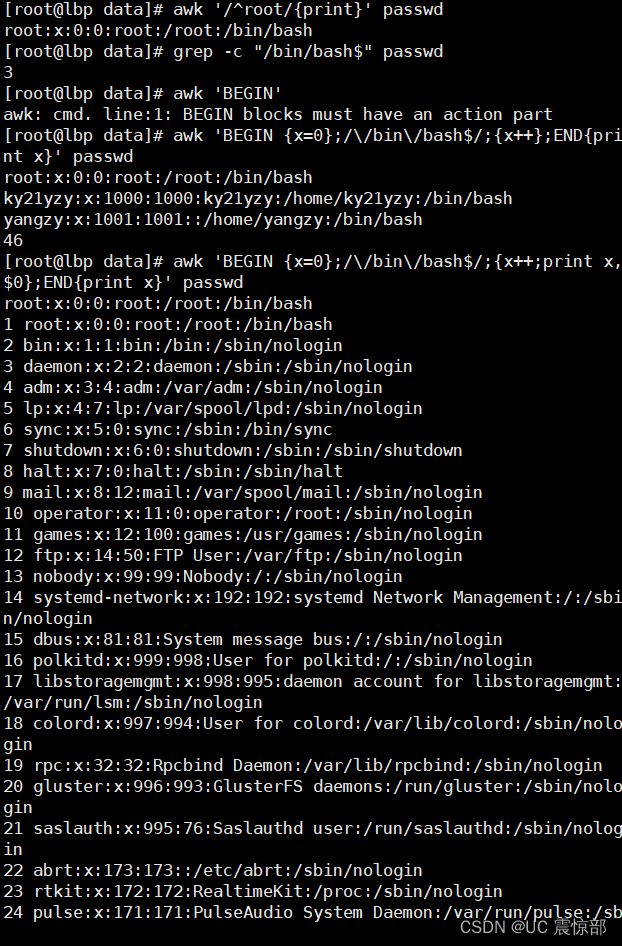 - [root@localhost ky15]#awk 'BEGIN {x=0};/\/bin\/bash$/ {x++;print x,$0};END{print x}' passwd