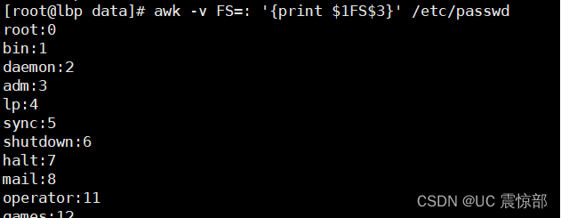 - [root@localhost ky15]#awk -v FS=: '{print $1FS$3}' /etc/passwd