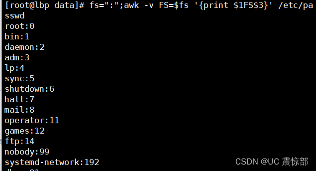 - [root@localhost ky15]#fs=":";awk -v FS=$fs '{print $1FS$3}' /etc/passwd