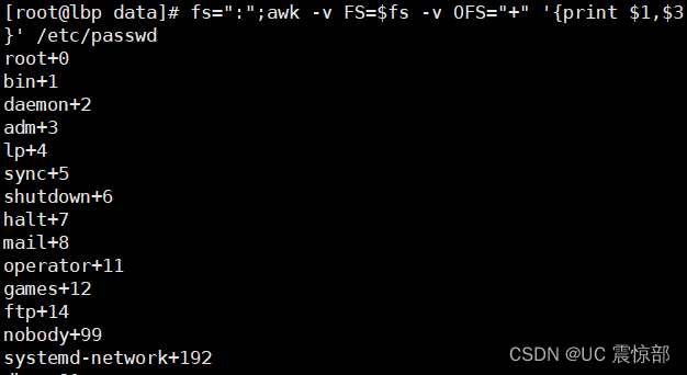 - [root@localhost ky15]#fs=":";awk -v FS=$fs -v OFS="+" '{print $1,$3}' /etc/passwd