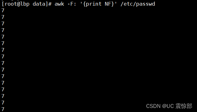 - [root@localhost ky15]#awk -F: '{print NF}' /etc/passwd