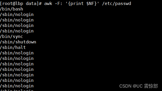 - [root@localhost ky15]#awk -F: '{print $NF}' /etc/passwd