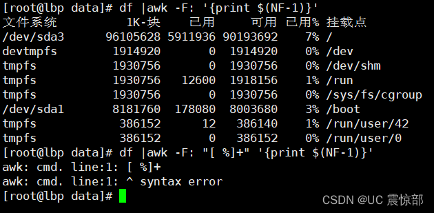 - [root@localhost ky15]#df|awk -F "[ %]+" '{print $(NF-1)}'