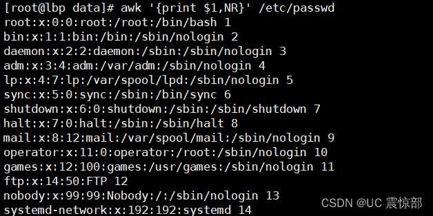 - [root@localhost ky15]#awk '{print $1,NR}' /etc/passwd