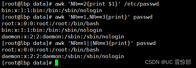 - [root@localhost ky15]#awk 'NR==1,NR==3{print}' passwd