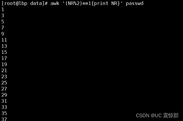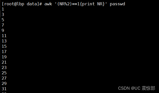 - [root@localhost ky15]#awk '(NR%2)==1{print NR}' passwd