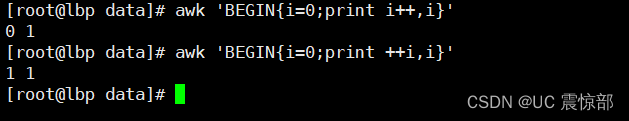 - [root@localhost ky15]#awk 'BEGIN{i=0;print ++i,i}'